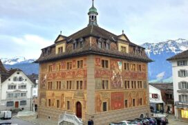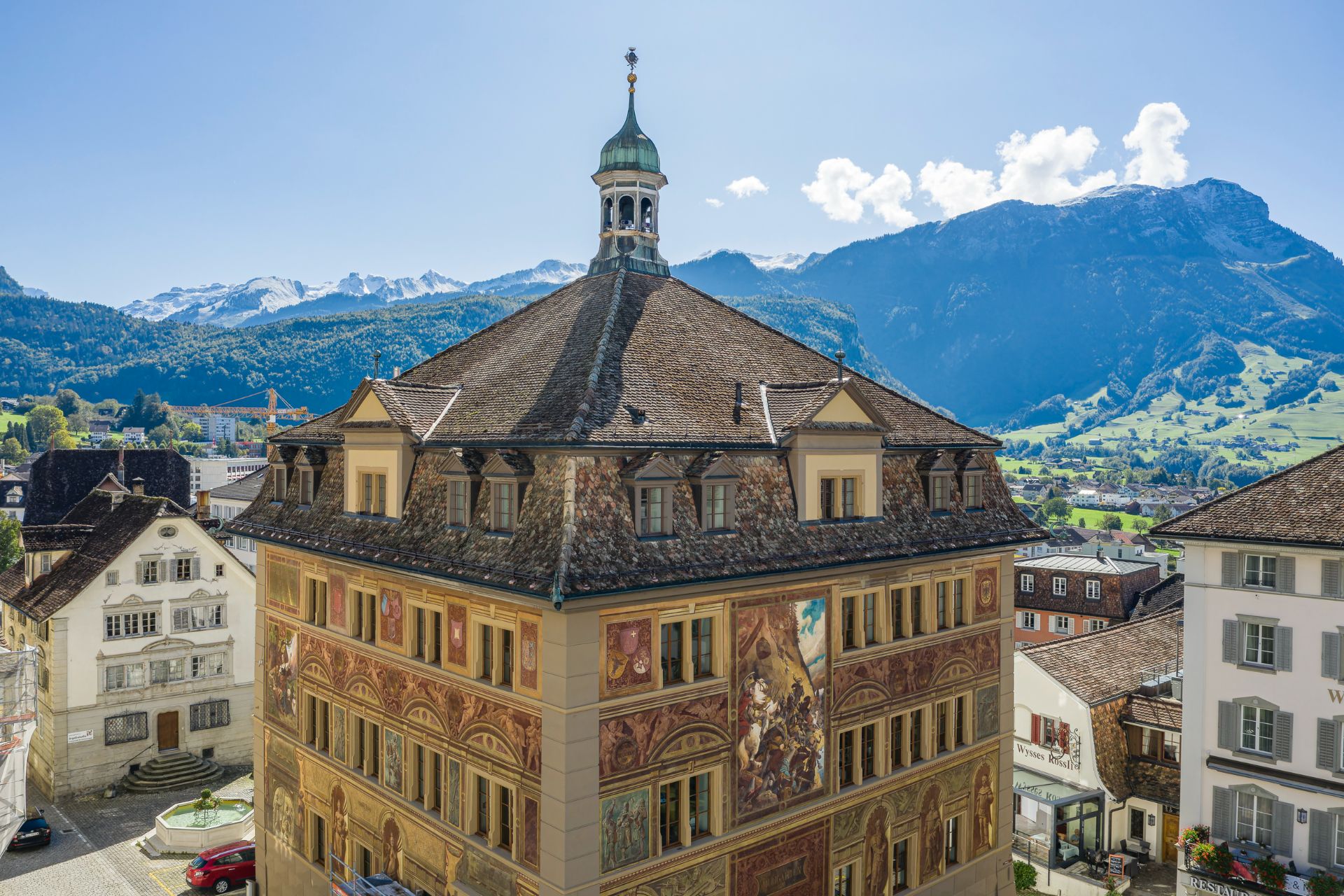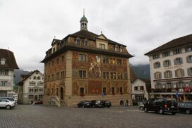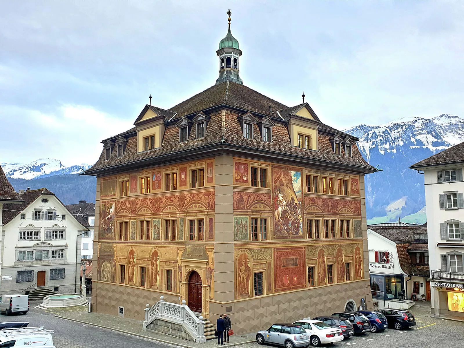 Историческа фасада художествен шедьовър от 1891 г.: кметството на гр. Швиц в Швейцария(Schwyz Town Hall).
